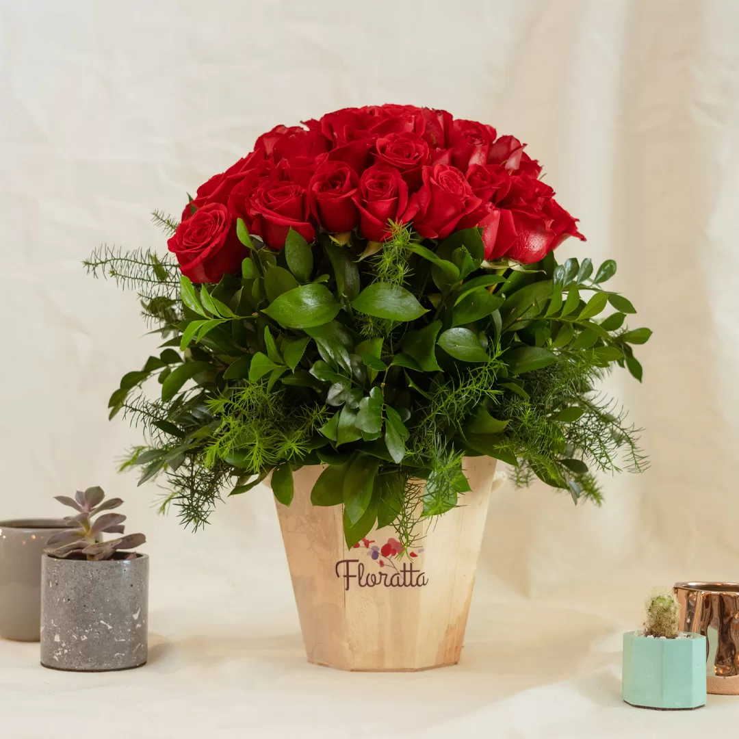 Balde en madera tamaño grande, decorado con topiario de 36 rosas y variedad de follaje verde* (ruscus y pino).